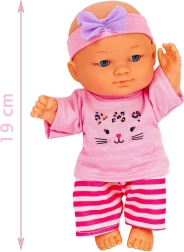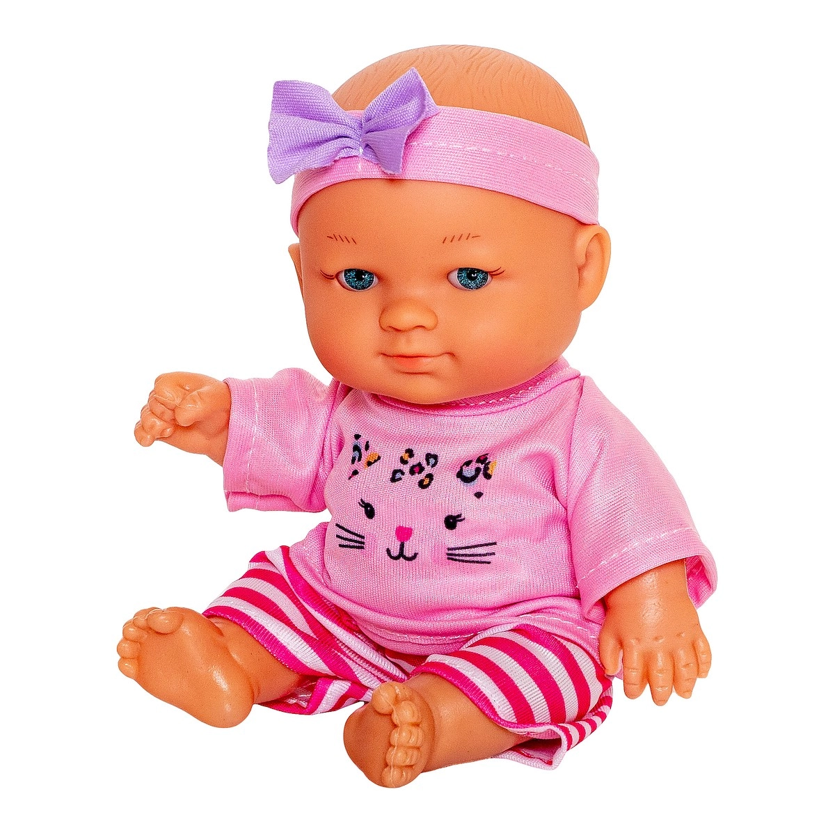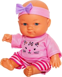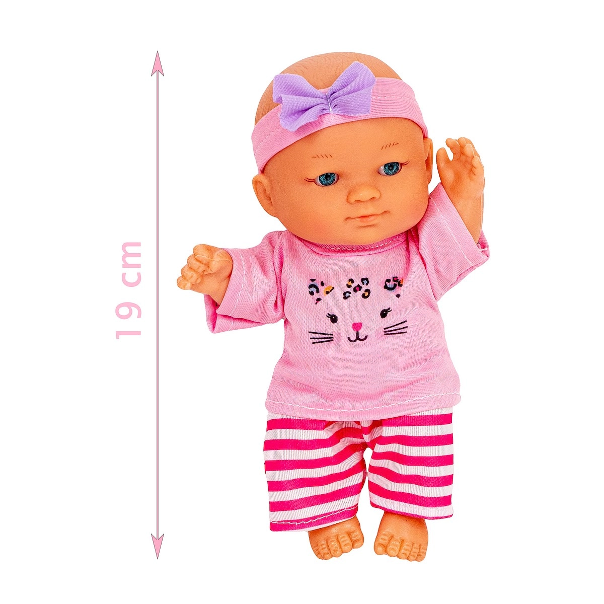 Julka poartă un top roz cu imprimeu cu pisicuță, colanți dungați și o bentiță cu fundiță – se îmbracă și se dezbracă ușor și invită la jocuri de imaginație.