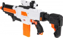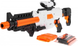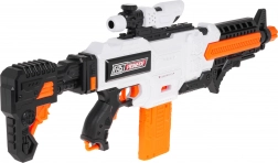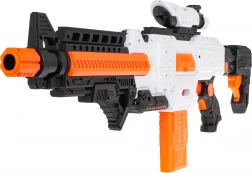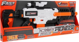 Blasterul Fast Pioneer în combinație alb-portocaliu-negru este ideal pentru bătălii acasă sau în aer liber. Mecanismul semi-automat cu arc asigură foc rapid și cursiv, câte un foc pe rând. Este suficient să încarci magazia, să ții apăsat butonul de alimentare, să țintești și să apeși pe trăgaci.