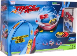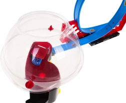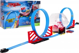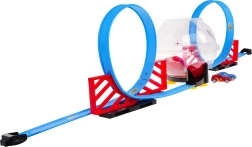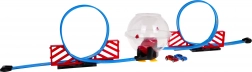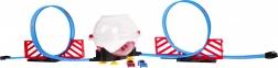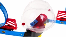 Construiește-ți propria arenă de curse cu pistă cu două benzi, două bucle și o sferă centrală transparentă. Datorită celor două trasee independente, copiii pot organiza adevărate dueluri de viteză. Prin tragerea mașinuței înapoi se activează mecanismul pull back, iar mașinuța pornește spre buclă, intră în sferă și realizează rotații captivante la interior.