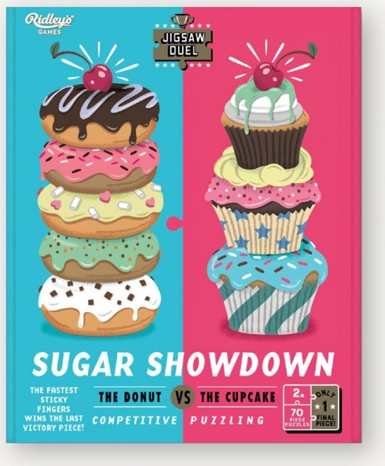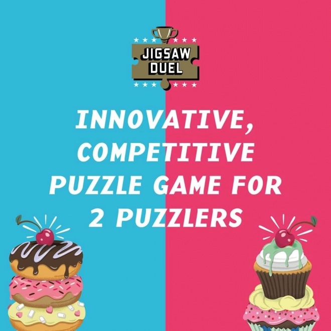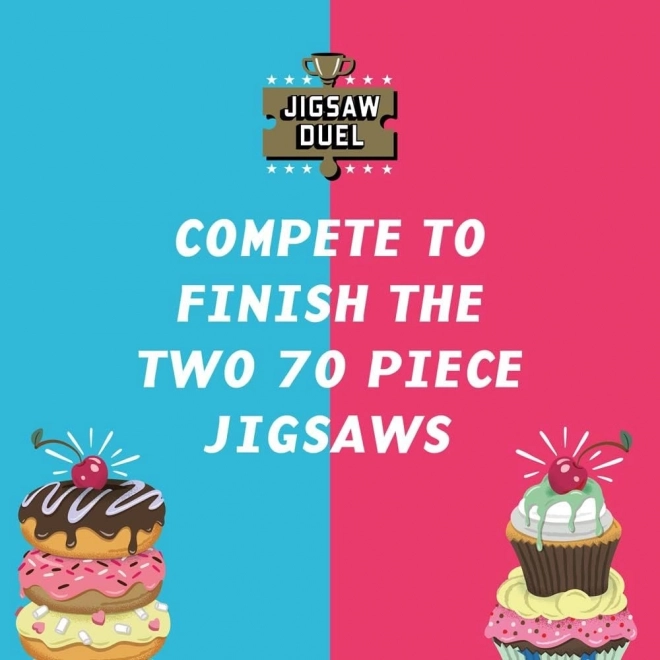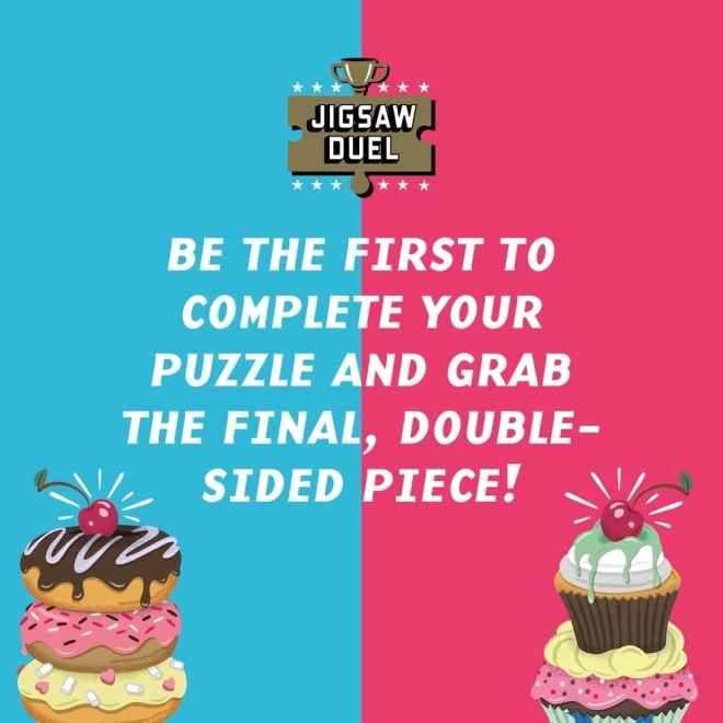 Alege-ți echipa – donut sau cupcake – și pornește duelul pentru titlul de cel mai rapid asamblor. Fiecare își asamblează propriul puzzle, dar despre câștigător decide ultimul piesaj dublu-fețat, care este comun pentru ambele puzzle-uri și te așteaptă în suportul din lemn.