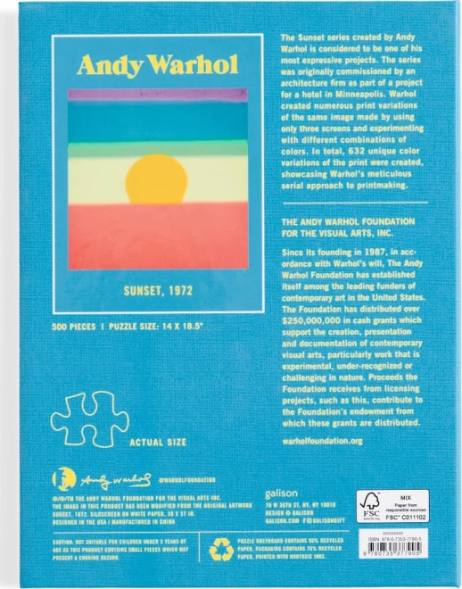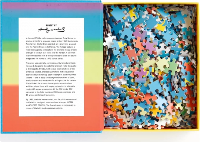 Puzzle stilat cu motivul iconic ANDY WARHOL: Apus de soare, oferă 500 de piese precise într-un ambalaj elegant în formă de carte. Cutia magnetică este practică pentru depozitare și potrivită pentru cadou. Include modelul motivului pentru o asamblare mai ușoară. Cadoul ideal pentru iubitorii de artă și pasionații de puzzle-uri.