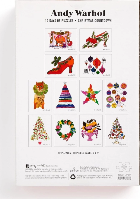 Descoperiți magia Crăciunului cu calendarul nostru advent de lux sub formă de puzzle-uri după Andy Warhol. Acest set excepțional include 12 puzzle-uri, fiecare cu 80 de piese, garantând zile pline de distracție și activitate creativă. Colecția este împodobită cu reproduceri ale motivelor iconice de Crăciun ale celebrului artist, făcând-o un cadou perfect pentru iubitorii de artă.