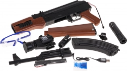 Jocul este confortabil și cursiv datorită acumulatorului de 3,7 V cu încărcare prin cablu USB. Sunt incluse și ochelari de protecție pentru joc sigur, încărcător detașabil, piese frontale/atasament tip amortizor și un șnur practic pentru purtare. Ideal pentru grădină, teren de joacă și role-play de acțiune.