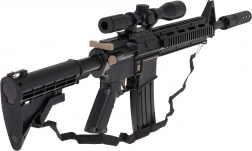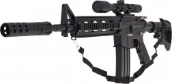 Marea pușcă militară cu bile de gel M4 este destinată copiilor de la 14 ani în sus. Trebuie utilizată cu bile speciale de hidrogel, care se sparg la impactul cu ținta. Pentru acest model se recomandă bile cu diametrul de 7-8 mm. Setul include un săculeț cu bile nehidratate. Bilele se pregătesc turnând apă peste ele și lăsându-le la înmuiat aproximativ 4-6 ore, apoi se scurge excesul de apă și muniția este gata. Pușca are mod de tragere manual și mod automat. Luneta armei este prevăzută cu o lupă, iar cu ajutorul unei rotițe se poate ajusta distanța țintei. Jucăria este alimentată de o baterie de 3,7V inclusă în set. |