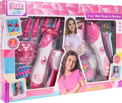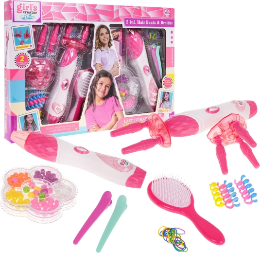 - aparat de împletit părul, aprox. 26,5 cm x 7,5 cm x 7,5 cm, .- aparat pentru aplicarea mărgelelor în păr, aprox. 26 cm x 5,5 cm x 5 cm, .- cutie pentru mărgele, aprox. 11 cm x 11 cm x 2 cm, .- mărgele aprox. 0,5 cm x 0,8 cm, .- perie de păr aprox. 14,5 cm x 6 cm x 2,5 cm, .- spirală pentru păr aprox. 4,5 cm x 1 cm, .- elastic de păr aprox. 9,5 cm x 1,3 cm x 2 cm, .- ambalaj aprox. 44,5 cm x 30,8 cm x 5 cm, . |