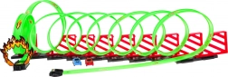 Construiește-ți propria lume a curselor. Setul conține 36 de piese pentru asamblarea facilă a unei piste cu mai multe bucle, linii drepte și un salt prin cercul de foc. Datorită mecanismului pull-back, este suficient să tragi mașinuța înapoi și să o eliberezi – pornește cu viteză mare, reușește loopinguri 360° și treceri dinamice.