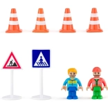 Setul include vehicule, figurine și semnalizare rutieră, astfel încât copiii își pot crea imediat propriul șantier și scenarii pline de imaginație.