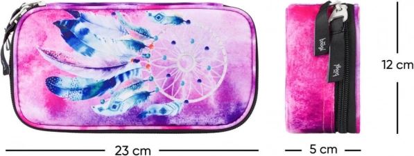 Penar școlar stilat, tip etui, cu motiv dreamcatcher, ideal pentru echiparea școlară de zi cu zi. Oferă construcție rigidă, clapetă internă rabatabilă pentru organizarea clară a instrumentelor de scris și o buzună internă cu fermoar practică. Include și buzunar pentru orar. Penarul este livrat fără conținut.
