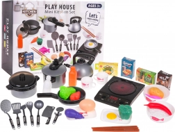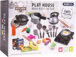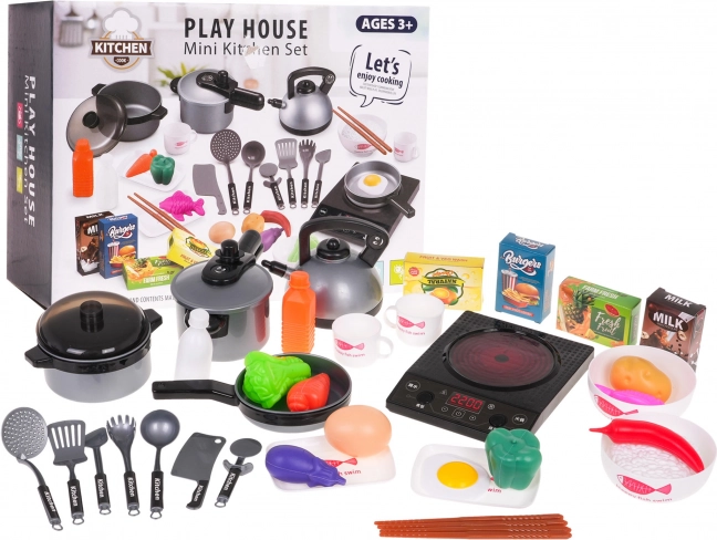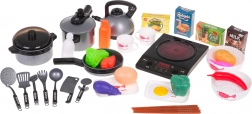 Acest set de bucătărie uimitor include tot ce are nevoie un mic bucătar. Plita cu inducție alimentată cu trei baterii AA permite sunete realiste de prăjire și fierbere, elemente din plastic sigure precum oale, tigăi și alte accesorii sunt ideale pentru jocul copiilor, fără margini ascuțite și risc de rănire. Setul conține diverse imitații de alimente, inclusiv ouă, pește și legume, care adaugă autenticitate jocului.