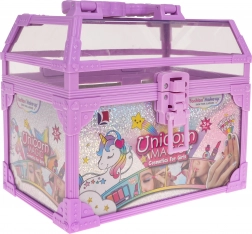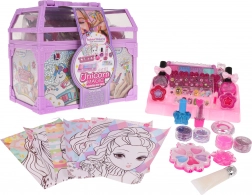 Conține diferite culori de lacuri de unghii, luciuri de buze și farduri de ochi. Totul este depozitat într-o cutie decorativă cu tematică de unicorn.