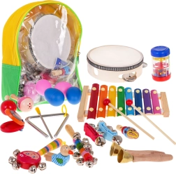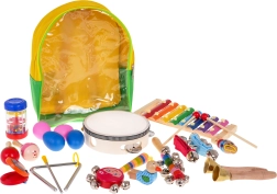Vă prezentăm un set mare de instrumente muzicale din lemn pentru copii de la 2 ani. Acest set colorat și sigur conține 23 de elemente diferite, toate depozitate într-un rucsac practic, ușor de transportat.