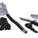 Setul include mască cu tub de respirație, pistol de jucărie, cuțit și alte accesorii realiste pentru jocuri de aventură.