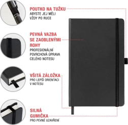 Acest carnet de notițe stilat este un partener de încredere pentru muncă, școală și timp liber. Coperțile tari cu finisaj durabil îți protejează notițele, iar elasticul le ține în siguranță laolaltă. Formatul compact A5 încape în majoritatea genților și rucsacurilor, astfel încât să îl ai mereu la îndemână.