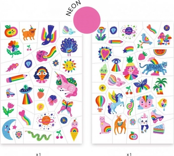 Tatuajele temporare sunt un accesoriu grozav pentru petrecerile copiilor, pentru punguțele cadou sau ca mică recompensă. Pachetul conține 2 foi cu peste 50 de modele în culorile curcubeului.