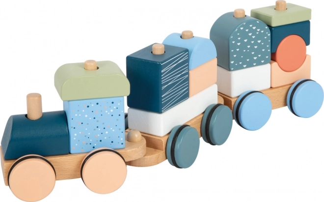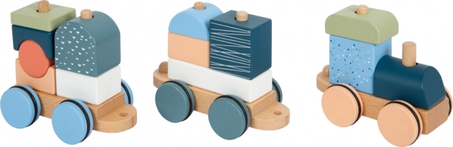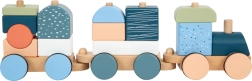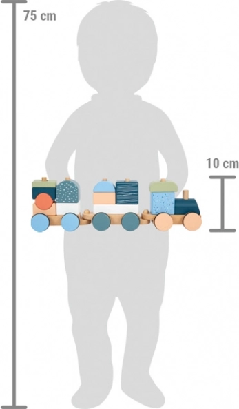 Trenulețul este și un puzzle de stivuire – cele 13 piese se pot introduce, combina și folosi separat ca blocuri de construcție.