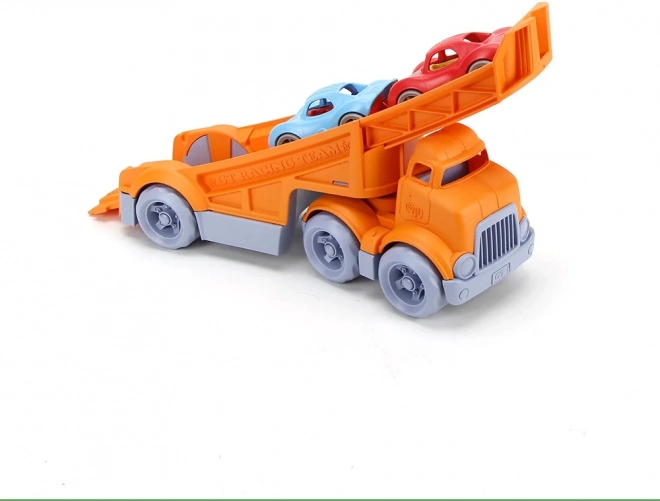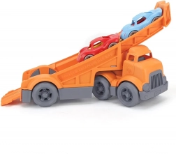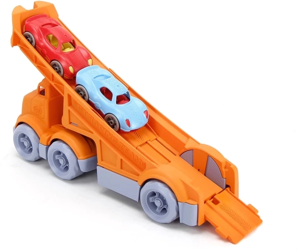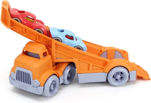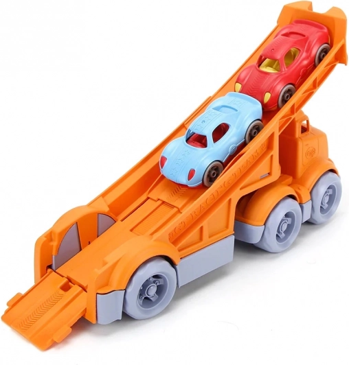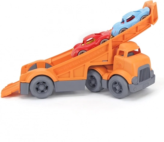Set de transport ecologic de la Green Toys, care aduce joacă sigură și distractivă pentru cei mici. Camion portocaliu robust, cu rampe lungă de urcare, transportă două mașinuțe de curse colorate. Fabricat din plastic reciclat din sticle de lapte, fără BPA, ftalați și PVC, potrivit pentru casă, nisip sau apă. Întreținere ușoară – se poate spăla în mașina de spălat vase.