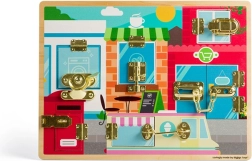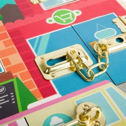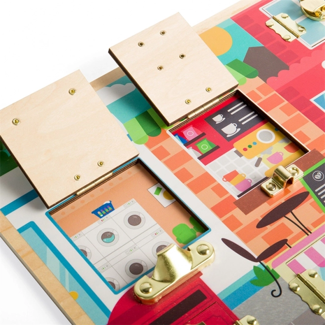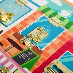 Această placă motrică din lemn, de calitate, în stil Montessori, oferă copiilor un spațiu sigur pentru exersarea prinderii, răbdării și rezolvării de probleme. În spatele fiecărei ușițe cu alt tip de sistem de închidere se află o scenă colorată (spălătorie, bucătărie, cafenea și altele) care motivează explorarea și întărește imaginația.