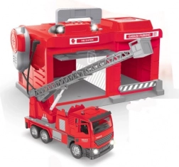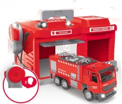 Acest set de joacă de pompieri – garaj aduce copiilor multă distracție autentică. La apăsarea butonului din partea superioară a vehiculului se activează lumini intermitente și efecte sonore realiste, care adaugă tensiune jocului. Butonul lateral pornește mesaje vocale, astfel încât copiii se pot bucura de aventuri și mai vii.