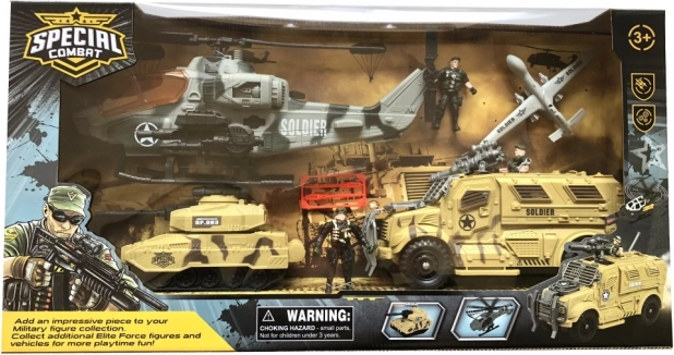 - Tanc, elicopter, vehicul de luptă, avion de recunoaștere, figurine de soldați și accesorii