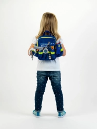 Bretle reglabile, multiple buzunare și căptușeală interioară cu motiv polițienesc care facilitează organizarea și transportul întregului set.