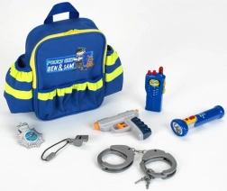 - Rucsac, lanternă, stație radio (jucărie), fluier, insignă de poliție, cătușe (jucărie), pistol cu apă