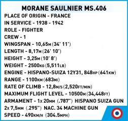 Descoperă legendarul avion de vânătoare francez Morane-Saulnier MS.406 sub forma unui set de construcție COBI de calitate, la scara 1:32. Setul redă fidel formele și coloritul aparatului și face trimitere la camuflajul piloților polonezi din Franța, 1940. Piesele au tampografii rezistente la uzură, care nu se estompează nici la joacă intensă – fără autocolante.