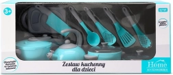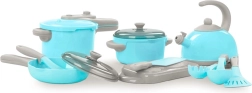 Set de bucătărie pentru copii, 11 piese le oferă micilor bucătari tot ce au nevoie pentru primele „găteli” în imaginația lor. Include un vas cu capac, tigaie, ceainic electric cu fluier, ustensile de bucătărie și alte accesorii într-o combinație modernă turcoaz-gri. De la 3 ani, realizat din plastic sigur și ușor de curățat.
