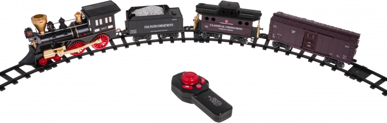 Pistă de tren retro cu telecomandă, pentru copii de la 5 ani, cu efecte de fum și luminoase. Sunete realiste, montare ușoară a șinelor și control sigur.