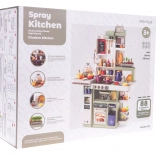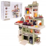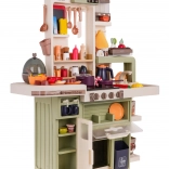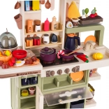 Bucătăria oferă efecte luminoase și sonore, alături de apă curgătoare și abur, permițând copiilor un joc realist.