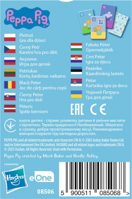 Joc de cărți distractiv Petruș Negru cu tematica PEPPA PIG pentru copii de la 4 ani. Dezvoltă concentrarea, spiritul de observație și abilitățile sociale. În pachet se află 25 de cărți cu personaje îndrăgite, iar regulile simple asigură un joc rapid și palpitant pentru până la 5 jucători.