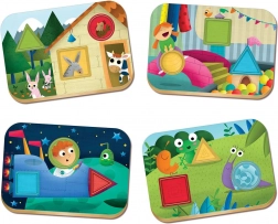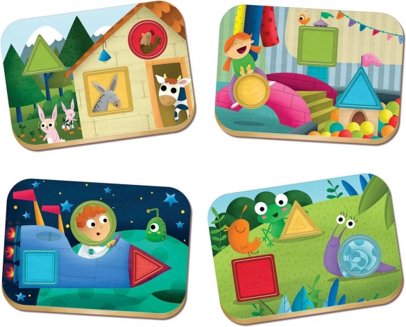 Această jucărie susține atenția copiilor, le dezvoltă imaginația și îi învață să recunoască forme geometrice și culori de bază în diverse medii: la fermă, în camera de joacă, la pajiște și în spațiu.