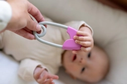 Culorile contrastante roz-gri sprijină percepția vizuală și atrag privirea copilului.