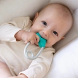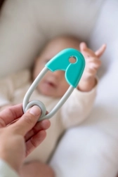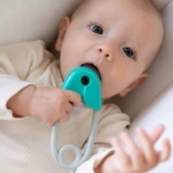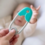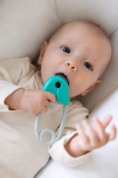 Zornitoarea ac de siguranță este o componentă esențială în dezvoltarea fiecărui bebeluș. Proiectat pentru a se potrivi în mâinile mici, cu un design turcoaz-gri care stimulează percepția vizuală a copilului. Zornitoarea este echipată cu bile mici care produc un sunet blând la mișcare, menținând atenția copilului și stimulând dezvoltarea auzului.