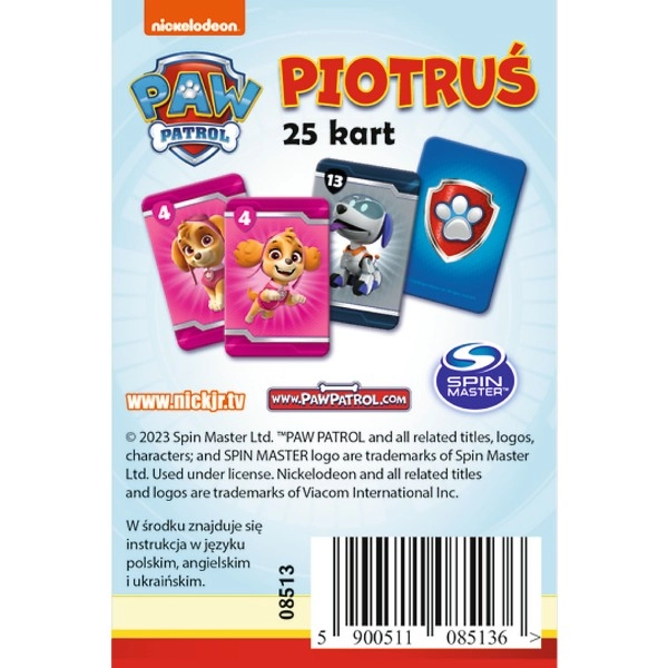 Joc de cărți Piotruś cu tematica PAW PATROL de la Trefl aduce un joc rapid și distractiv pentru copii de la 4 ani. Reguli simple, personaje îndrăgite și dezvoltarea atenției și concentrării fac din acest joc o alegere grozavă pentru momentele în familie și pentru călătorii.