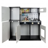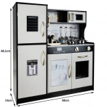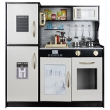 Bucătăria elegantă din lemn XL de la KRUZZEL, în combinație de negru, alb și auriu, le oferă copiilor un joc realist de gătit. Oferă iluminare LED, efecte sonore ale arzătoarelor, elemente interactive și accesorii bogate incluse (oală, tigaie, capac, 4 linguri). Chiuveta detașabilă, cuptorul, cuptorul cu microunde și dulapurile cu închidere „click” susțin creativitatea, învățarea prin joc și jocul de rol.