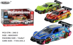 Mașinuță de curse din metal cu dimensiuni 11x4,5x3,2 cm oferă distracție prin recul în trei variante de culori - verde, roșu și albastru.