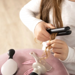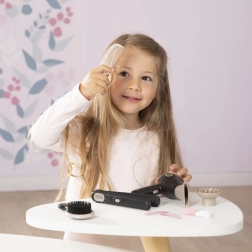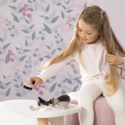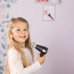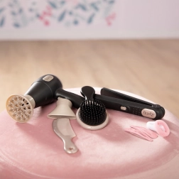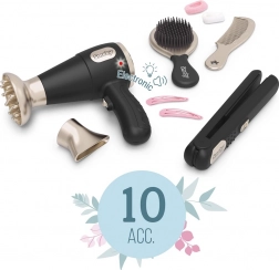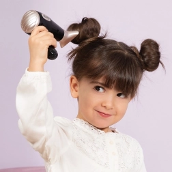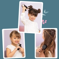 - Multe posibilități amuzante – tot ce are nevoie un coafor începător: uscător, duze interschimbabile pentru uscător, placă de îndreptat, perie, pieptene, agrafe și elastice de păr.