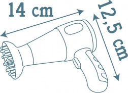 - Dimensiuni și destinație – setul de coafor are dimensiunile 14x4,5x12,5 cm; uscătorul funcționează cu 2 baterii AAA de 1,5V, neincluse în pachet; jucărie pentru băieți și fete de la 3 ani.