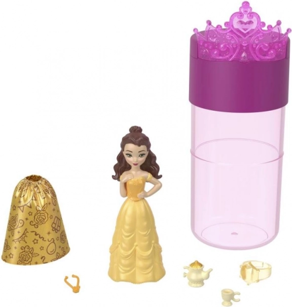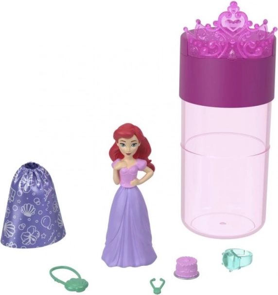 Începe prin a deschide tubul, în care vei găsi o mini păpușă misterioasă (aprox. 3,5"/9 cm) acoperită cu stratul Color Reveal și trei plicuri cu accesorii. Umple tubul cu apă, scufundă păpușa și rotește-o ușor – în câteva clipe i se dezvăluie aspectul caracteristic inspirat de filmele îndrăgite Disney.