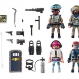 - Set de 37 piese cu figurine de polițiști, incluzând patru figurine PLAYMOBIL, trei membri ai grupului operativ Tactic și o infractoare, butelie de scafandru, cască, GPS, rangă și mult echipament special pentru urmăriri pline de acțiune în camera copilului.