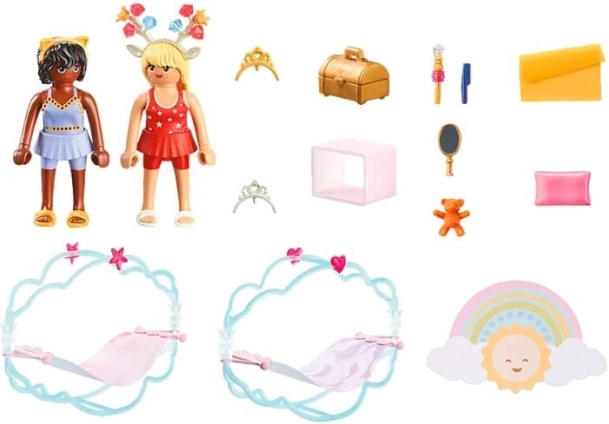 - Set complet: Include două figurine PLAYMOBIL, două paturi în formă de nori cu hamace, stele decorative, o ladă de comori și multe alte accesorii grozave.