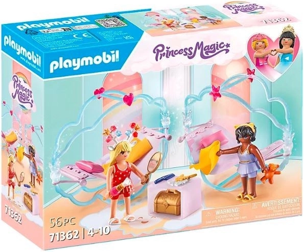 Bucurați-vă de aventuri cu prințesele curcubeului la petrecerea pijamalelor cerești PLAYMOBIL. Înainte ca cele două prințese curcubeu să se așeze în paturile magice suspendate, sunt împodobite cu bijuterii strălucitoare, apoi călătoresc în lumea viselor și a imaginației cu personaje de basm și împrejurimi magice.