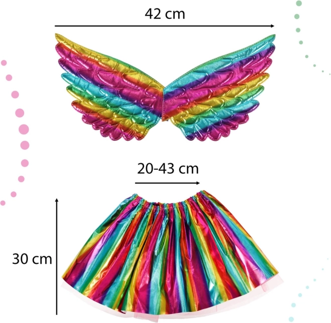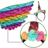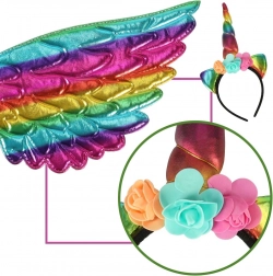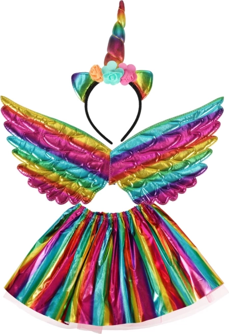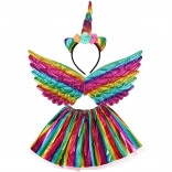 Pachetul include tot ce aveți nevoie - aripi curcubeu, bentiță cu corn și fustă, ideal pentru orice sărbătoare.