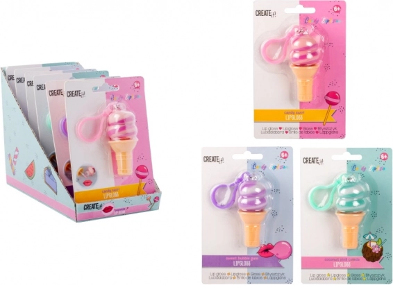 Un luciu de buze drăguț în formă de cornet cu înghețată, care în același timp servește drept breloc. Disponibil în trei variante de culoare și trei arome, ideal pentru revigorarea rapidă a buzelor și ca accesoriu stilat pentru geantă sau chei.