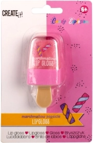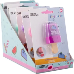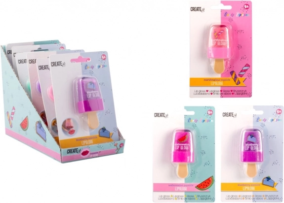 Luciu de buze Candy în formă de înghețată pe băț. Trei variante de culoare – trei arome – afine, pepene și bezea (marshmallow).