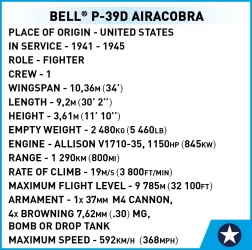 Bell P-39D Airacobra este un avion de vânătoare american cu un singur motor din perioada celui de-al doilea război mondial, care se remarcă prin viteză maximă mare și performanță la altitudini joase. Acest set de construcție vă permite să vă întoarceți în timp și să vă creați propriul model al acestui avion la scară 1:32. Modelul este detaliat și oferă multe părți mobile, cum ar fi elice care se rotește, flapsuri mobile și roți cu pneuri de cauciuc. Cabina poate fi deschisă pentru a introduce figurina pilotului istoric.
