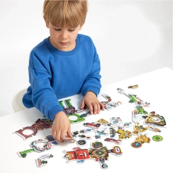 Descoperă puzzle-ul creativ cu roboți, care conține 63 de piese din carton rezistent, dintre care 28 sunt duble-față. Piesele pot fi combinate liber între ele, astfel încât copiii asamblează până la 8 roboți mari și apoi le pot schimba nelimitat aspectul și funcțiile. Jocul dezvoltă motricitatea fină, gândirea logică, creativitatea și răbdarea – distracție ideală pentru preșcolarii pasionați de tehnică și invenții.