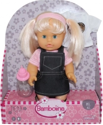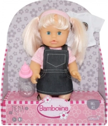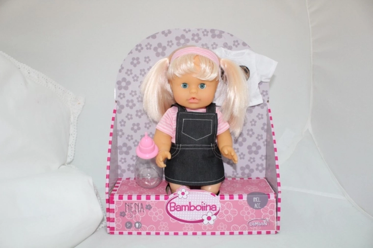 Păpușa cu codițe blonde este așezată într-o cutie roz atrăgătoare marca Bambolina – pregătită să încânte ca dar.