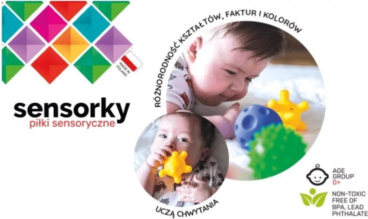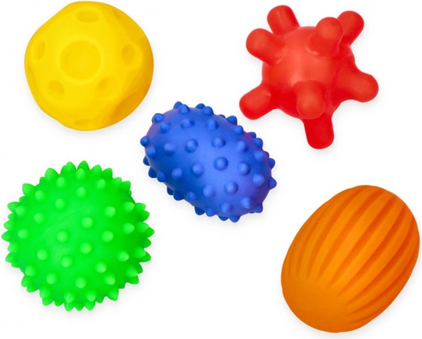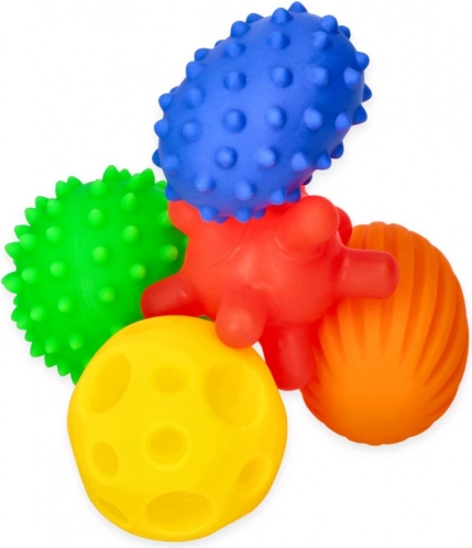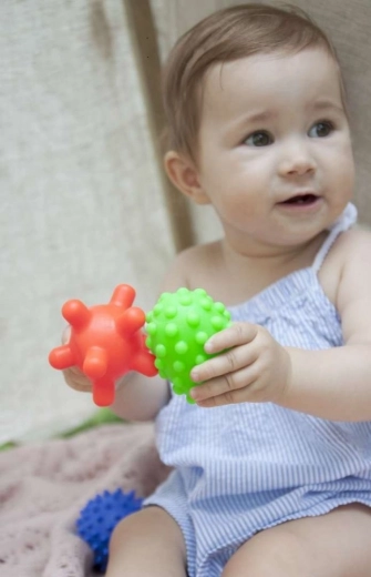 Setul de 5 mingiuțe senzoriale colorate cu proeminențe, țepișori și striații susține percepția formelor și a texturilor, concentrarea și dezvoltarea naturală a simțurilor. Datorită materialului moale, mingiuțele sunt ușor de prins de mânuțele mici, fiind potrivite pentru joacă acasă, pe pătură sau în cadă.