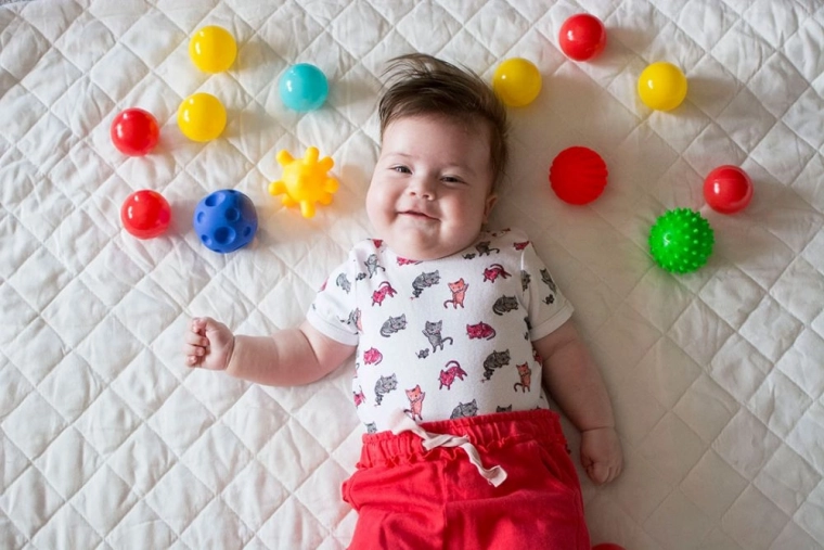 - Suprafețe variate pentru stimulare tactilă, prindere ușoară, potrivite pentru rostogolit și strâns